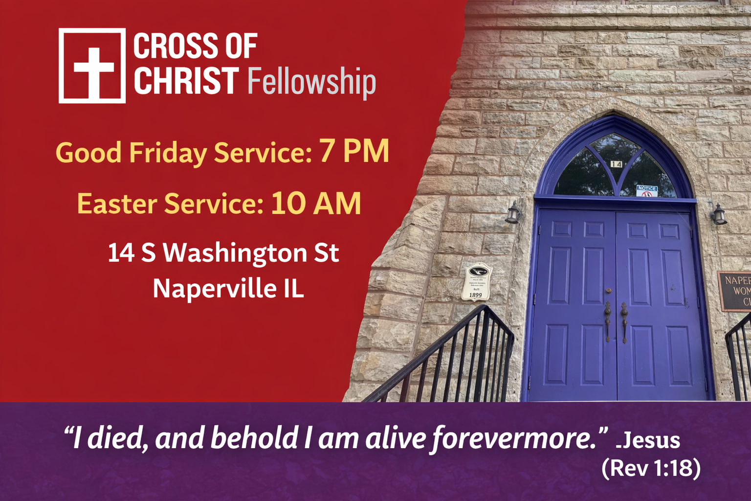 Join us for our Good Friday Service (4/3 at 7 P.M.) and Easter Worship Service (4/5 at 10 A.M.) at the Old Stone Church (14 S Washington St.) in downtown Naperville.